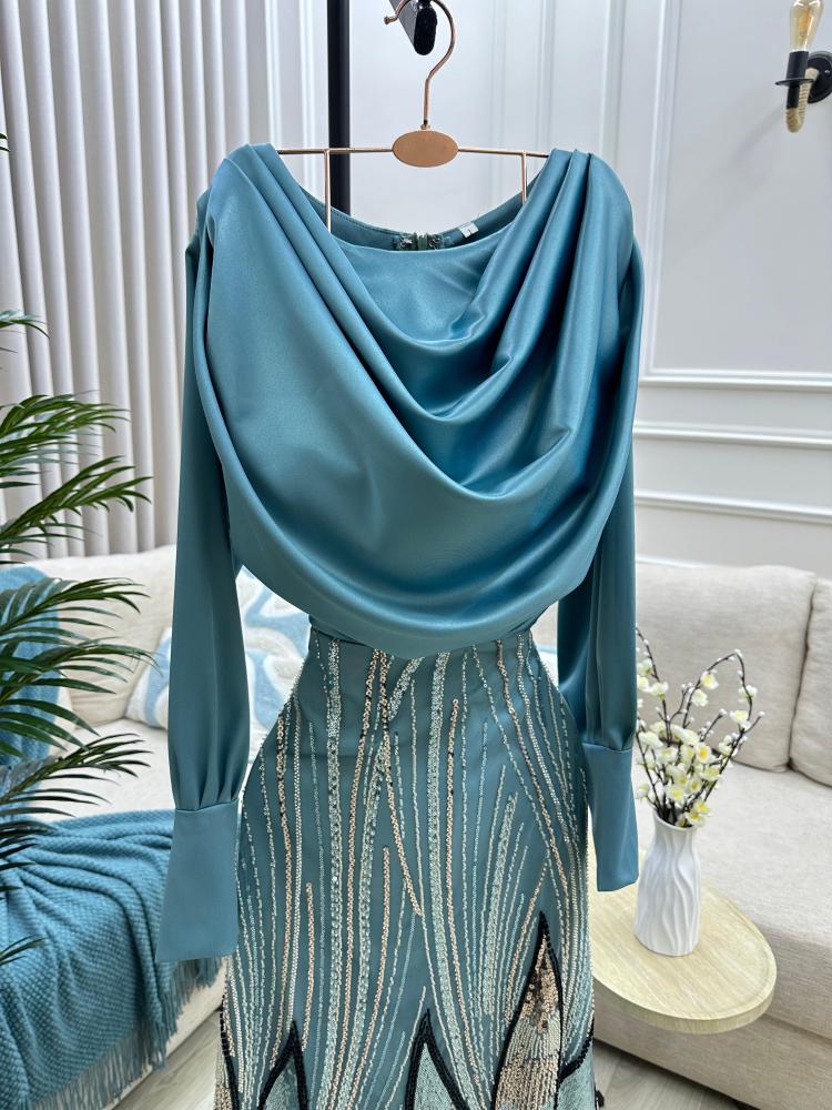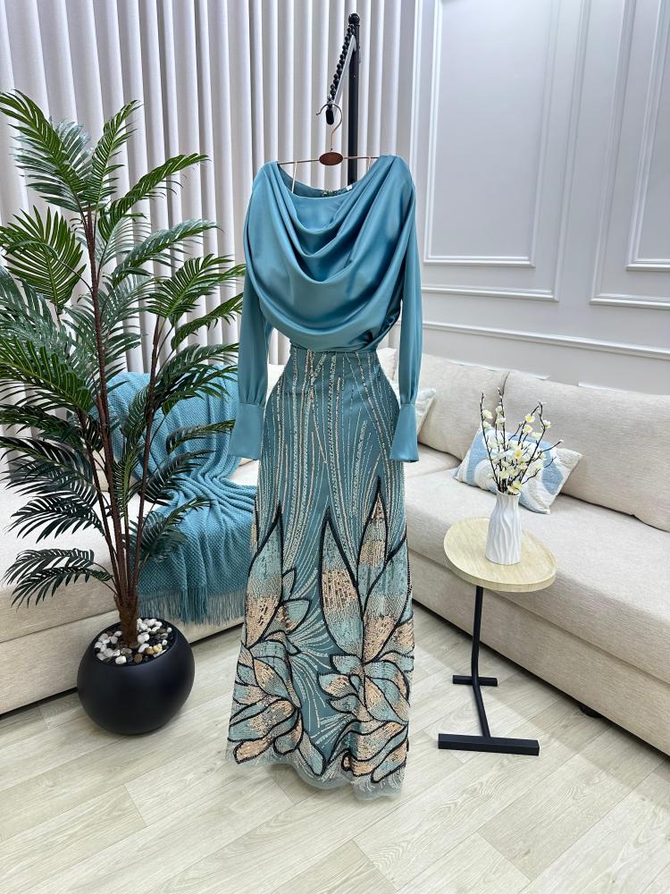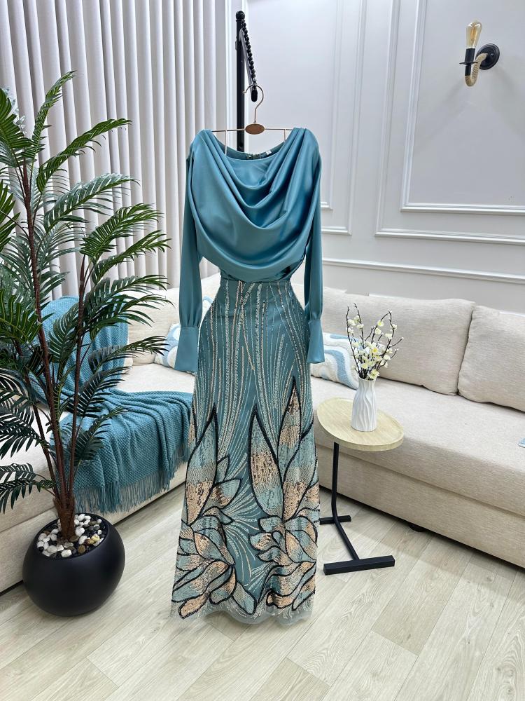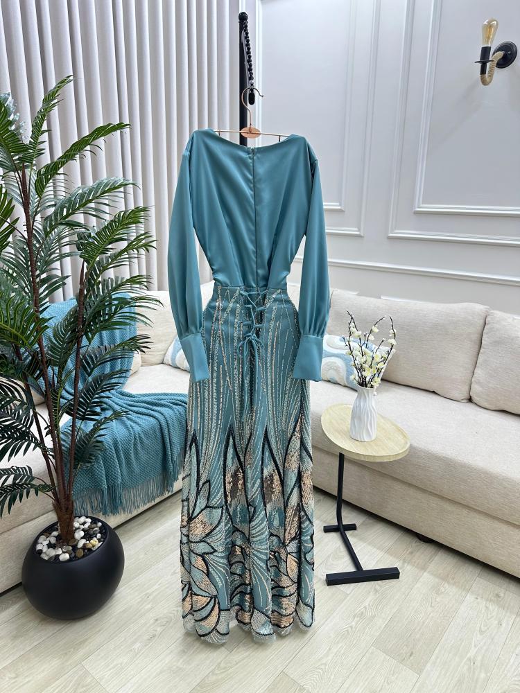 إطلالة ملكية تبدأ من هنا — تألقي بفستان سهره راقي بلونه السماوي وتطريزه الفاخر، متوفر الآن عبر لين فاشن لتعيشي لحظتك بكل أناقة.